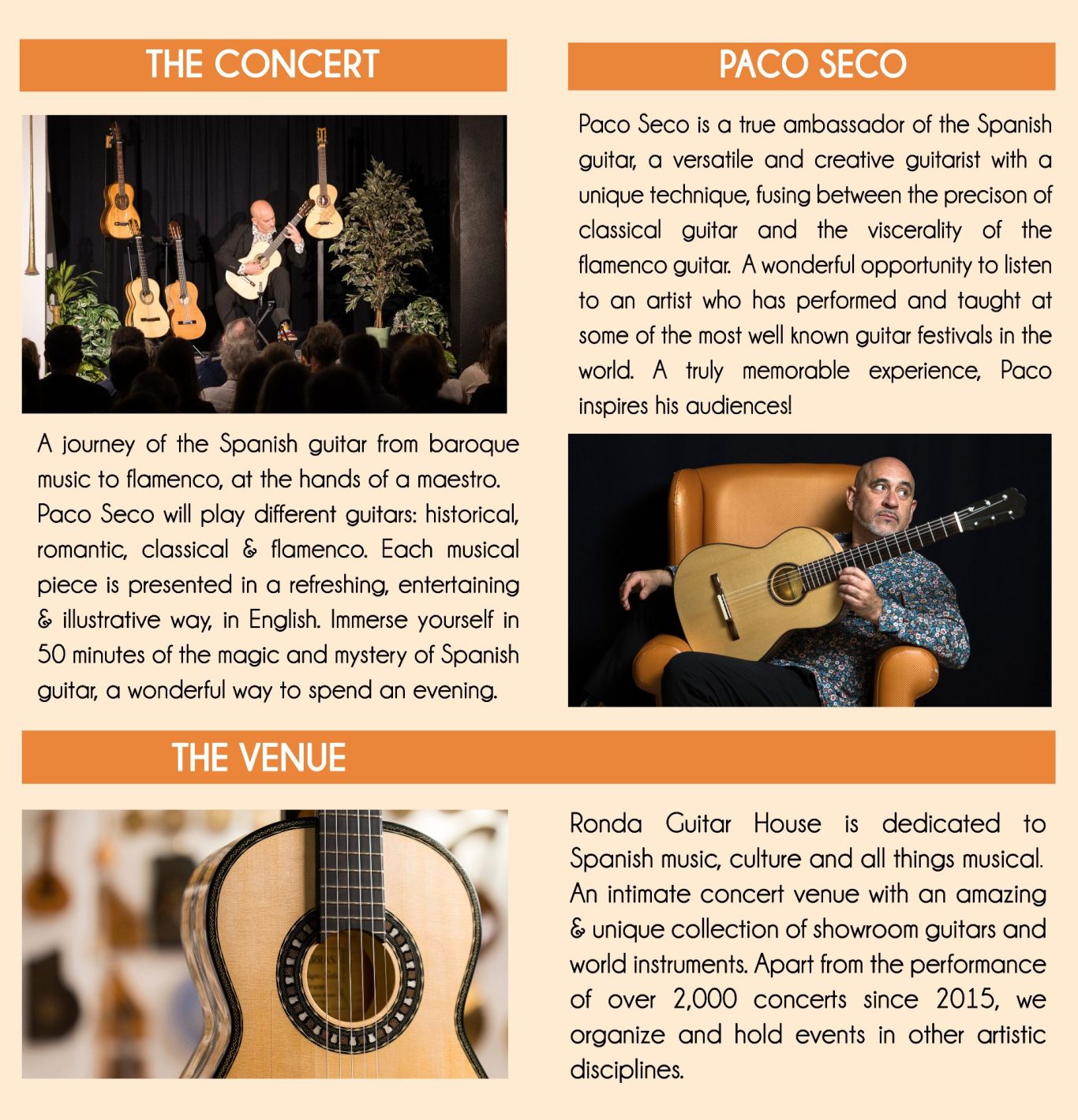 Each concert performed by Paco Seco presents Spanish musical traditions through storytelling and live interpretation, making it